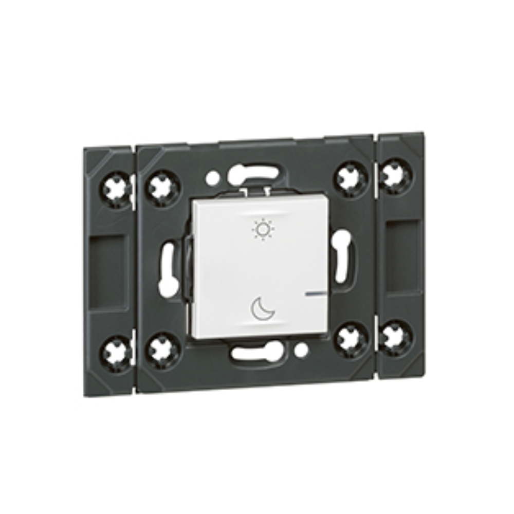 - Supplied with cover plate, multi-standard support frame (with removable fins) and 2 removable stickers for fixing the control unit on any substrate