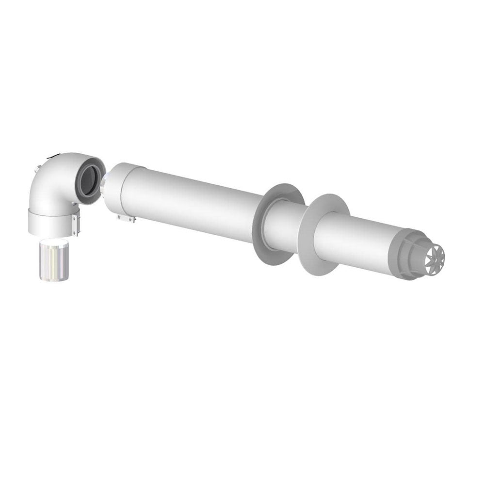 Coaxial kit Ø60 / 100 L mm in AL / PPS with horizontal start, complete with 90 ° bend and wall outlet terminal. EPDM clamps, gaskets, fixing screws and wall cover nuts.